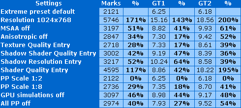 Изменение любой из этих опций, кроме «Disable PPU», при выбранном наборе настроек, вызовет смену пресета на «Custom». Эта возможность используется для более глубокого анализа производительности, изменением тех или иных настроек можно добиться дополнительных данных о производительности системы. Но сравнивать придётся только результаты по конкретным тестам, так как общее количество очков при «Custom» настройках не рассчитывается. Рассмотрим влияние всех опций на производительность в виде общего числа очков GPU Marks, и отдельно по графическим тестам (в процентах указан относительный прирост):