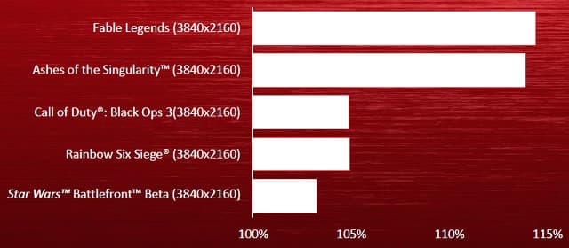 Radeon Software Crimson Edition обеспечивает улучшение производительности практически всем пользователям видеокарт Radeon, но в разном размере и в зависимости от условий. К примеру, прирост в частоте кадров для одного из популярных DirectX 12 бенчмарков Fable Legends составляет 7-20%, в зависимости от разрешения: FullHD или 4K, в последнем случае увеличение производительности будет меньше. Этот тест был проведён на системе с видеокартой AMD Radeon R9 Fury X, сравнивались драйверы Radeon Software Crimson Edition с довольно старым уже выпуском AMD Catalyst 15.7.1.