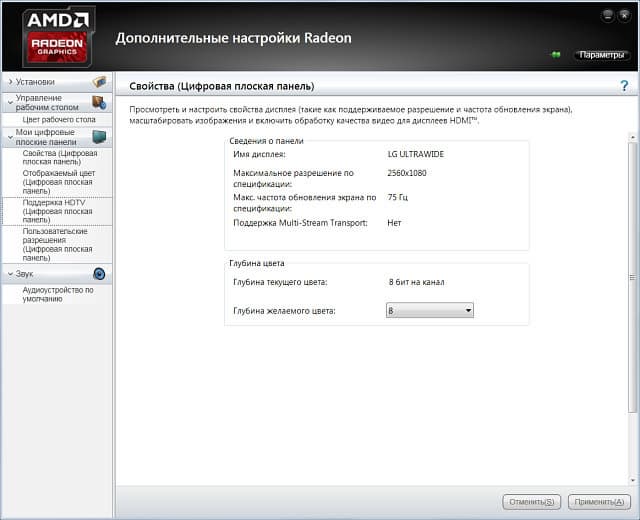 Кнопка дополнительных настроек вызывает отдельное окно с совершенно иным интерфейсом, знакомым нам по предыдущим версиям CCC — тут можно настроить некоторые дополнительные параметры по работе с дисплеями и звуком, которые (пока что?) не вошли в Radeon Settings: