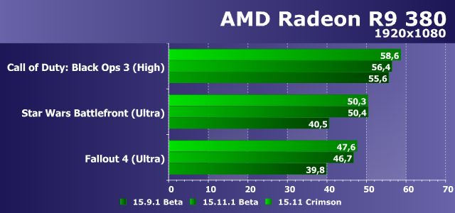 Набор игр для нашего собственного экспресс-теста получился таким: Star Wars Battlefront, Fallout 4 и Call of Duty: Black Ops 3. Для наших измерений мы использовали видеокарту модели Radeon R9 380 и тестовую систему на базе топового процессора Intel под управлением операционной системы Windows 7 SP1, взяли разрешение 1920×1080 и старались выставить максимальные игровые настройки (кроме весьма требовательной Call of Duty: Black Ops 3, где были выставлены настройки уровня High). Посмотрим, получились ли у нас приросты скорости в этих играх?