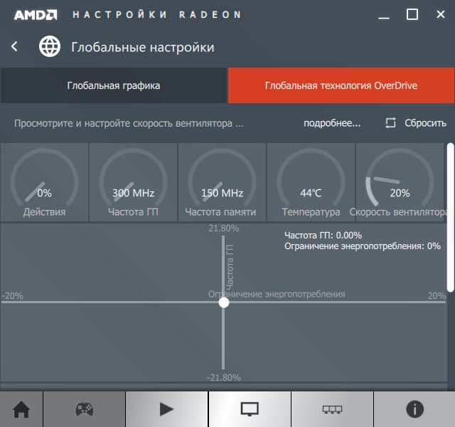 Тут же рядом настраиваются и возможности разгона, привычные по набору настроек, но в новом интерфейсе. На этой панели можно посмотреть текущие частоты, температуру, скорость вентилятора, а также изменить целевые частоты, потребление энергии и скорость вентилятора — всё как обычно.