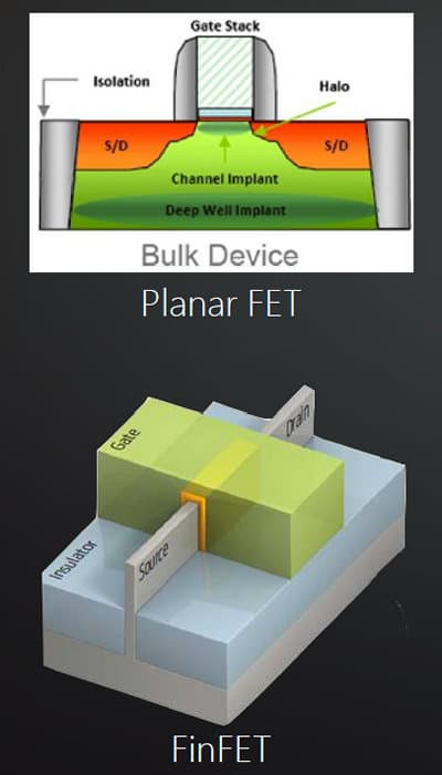 Если говорить вкратце, то FinFET-транзистор — это транзистор с каналом, окружённым затвором через прослойку в виде изолятора с трёх сторон — по сравнению с планарным, где поверхность сопряжения — это одна плоскость. Как видно даже на схеме, FinFET-транзисторы имеют более сложное устройство, и трудностей при реализации новой технологии было предостаточно. Первые данные о таком устройстве появились ещё в 1989 году, так они были названы лишь в 2000, а до производства первой их довела компания Intel — в уже далёком 2012 году.