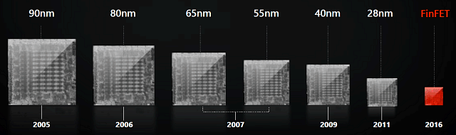 И всё же главное в Polaris — вовсе даже не модифицированные и даже не какие-то новые аппаратные блоки. Ещё больший шаг в производительности, а значит и энергоэффективности, обеспечивается применением совершенно нового техпроцесса в производстве GPU будущего поколения — с использованием транзисторов с вертикально расположенным затвором (FinFET — Fin Field Effect Transistor), также известных как транзисторы с трёхмерной структурой затвора или 3D-транзисторы.