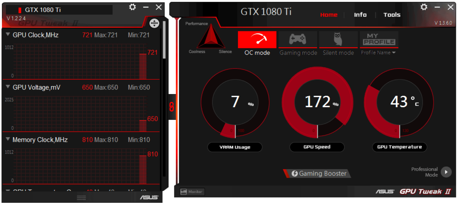 Asus Poseidon Platinum GeForce GTX 1080 Ti (11 ГБ) на момент написания материала — один из лучших (возможно, даже лучший) вариантов топового однопроцессорного ускорителя, демонстрирующий при использовании штатной воздушной СО производительность в среднем на 6%-7% выше, чем референсный GTX 1080 Ti. Карта имеет красивую подсветку на кулере для любителей моддинга, а также отлично подойдет любителям разгона, позволяя гибко и максимально эффективно регулировать частоты и напряжения. Штатная воздушная система охлаждения достаточно шумная, но карта предусматривает возможность монтажа ЖСО, что заодно должно повысить и без того неплохой разгонный потенциал. GTX 1080 Ti является на сегодня самым быстрым ускорителем, его штатной производительности более чем хватает для всех современных игр даже в разрешении 4K, так что карта Asus полностью готова для работы с устройствами VR.