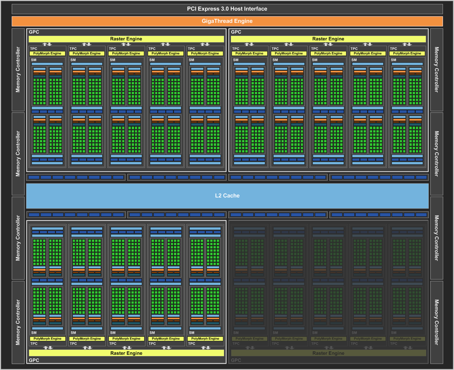 Видеочип GP104 по своему устройству схож с аналогичными решениями архитектуры Maxwell, и подробные данные об устройстве современных GPU вы можете найти в наших обзорах предыдущих решений компании Nvidia. Как и предыдущие графические процессоры, чипы новой архитектуры будут иметь разную конфигурацию вычислительных кластеров Graphics Processing Cluster (GPC), потоковых мультипроцессоров Streaming Multiprocessor (SM) и контроллеров памяти, и в GeForce GTX 1070 уже произошли некоторые изменения — часть чипа была заблокирована и неактивна (выделено серым):