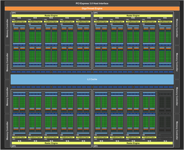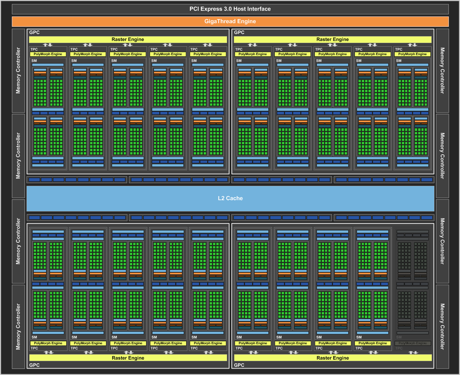 Каждый из потоковых мультипроцессоров Streaming Multiprocessor (SM) спарен с движком PolyMorph Engine, который обрабатывает текстурные выборки, тесселяцию, трансформацию, установку вершинных атрибутов и коррекцию перспективы. Комбинация мультипроцессора SM с одним движком Polymorph Engine традиционно для Nvidia называется TPC — Texture Processor Cluster, а несколько TPC вместе с движком растеризации основывают графические кластеры — Graphics Processor Cluster (GPC).