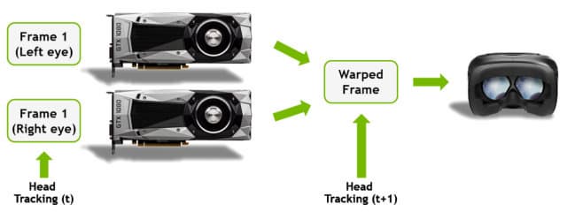 Такой подход потребовался потому, что AFR плохо подходит для VR, так как с его помощью первый GPU будет отрисовывать четный кадр для обоих глаз, а второй — нечетный, что ничуть не снижает задержки, критически важные для систем виртуальной реальности. Хотя частота кадров при этом будет достаточно высокой. Так что при помощи VR SLI работа над каждым кадром разделяется на два GPU — один работает над частью кадра для левого глаза, второй — для правого, а затем эти половинки кадра объединяются в целый.
