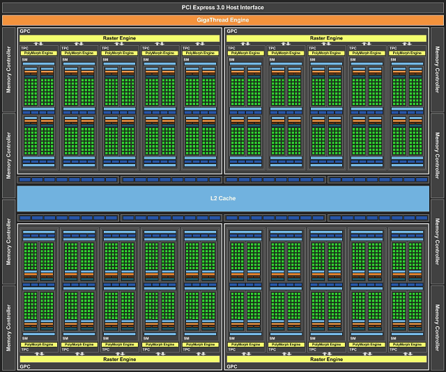 | Вычислительные блоки | 20 потоковых мультипроцессоров, включающих 2560 скалярных ALU для расчетов с плавающей запятой в рамках стандарта IEEE 754-2008; |