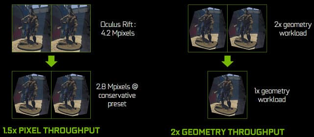 Такой подход способен прилично экономить в производительности. Так, типичное изображение для Oculus Rift на каждый глаз составляет 1,1 мегапиксель. Но из-за разницы в проекциях, чтобы его отрендерить, используется исходное изображение в 2,1 мегапикселя — на 86% больше необходимого! Применение мультипроецирования, внедренного в архитектуру Pascal, позволяет снизить разрешение отрисовываемого изображения до 1,4 мегапикселей, получив полуторакратную экономию в скорости пиксельной обработки, а также экономит пропускную способность памяти.