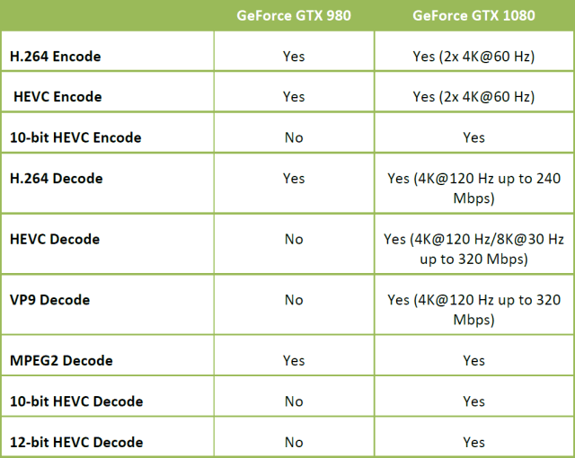 Новая модель видеокарты Nvidia получила и улучшенный блок декодирования и кодирования видеоданных. Так, чип GP104 соответствует высоким стандартам PlayReady 3.0 (SL3000) для воспроизведения потокового видео, позволяющим быть уверенным в том, что проигрывание высококачественного контента от известных поставщиков, вроде Netflix, будет максимально качественным и энергоэффективным. Подробности о поддержке различных форматов видео при кодировании и декодировании приведены в таблице, новинка явно отличается от предыдущих решений в лучшую сторону: