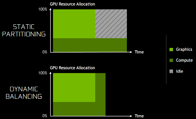 Для улучшения работы этого сценария, в архитектуре Pascal появилась динамическая балансировка загрузки (dynamic load balancing). В предыдущей архитектуре Maxwell перекрывающиеся нагрузки были выполнены в виде статического распределения ресурсов GPU на графические и вычислительные. Такой подход эффективен при условии, что баланс между двумя нагрузками примерно соответствует разделению ресурсов и задачи выполняются одинаково по времени. Если же неграфические вычисления выполняются дольше графических, и обе ожидают завершения общей работы, то часть GPU оставшееся время будет простаивать, что вызовет снижение общей производительности и сведет всю выгоду на нет. Аппаратная динамическая балансировка загрузки же позволяет использовать освободившиеся ресурсы GPU сразу же как они станут доступными — для понимания приведем иллюстрацию.