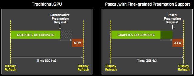 В случае точного прерывания на уровне пикселей и потоков (на иллюстрации справа), такая возможность дает большую точность в определении момента прерывания, и асинхронное искажение времени может быть запущено значительно позже с уверенностью в завершении работы до начала обновления информации на дисплее. А простаивающий некоторое время в первом случае GPU можно загрузить какой-то дополнительной графической работой.