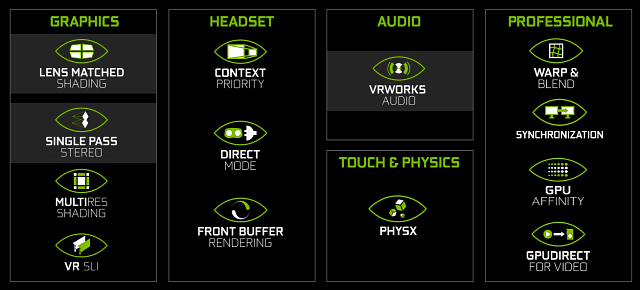 Для того, чтобы уменьшить разницу в качестве между VR-играми и обычными, в Nvidia решили выпустить целый пакет соответствующих технологий VRWorks, в который вошло большое количество API, библиотек, движков и технологий, которые позволяют значительно улучшить как качество, так и производительность VR-приложений. Как это относится к анонсу первого игрового решения на Pascal? Очень просто — в него внедрили некоторые технологии, помогающие увеличить производительность и улучшить качество, и мы о них уже писали.