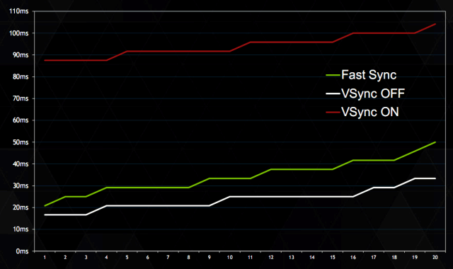 Такой метод позволяет изменять способ вывода на экран и брать лучшее от режимов VSync On и VSync Off, получив низкие задержки, но без артефактов изображения. С Fast Sync нет управления потоком кадров, игровой движок работает в режиме отключенной синхронизации и ему не говорят подождать с отрисовкой очередного, поэтому и задержки почти такие же низкие, как у режима VSync Off. Но так как Fast Sync самостоятельно выбирает буфер для вывода на экран и выводит кадр целиком, то нет и разрывов картинки.
