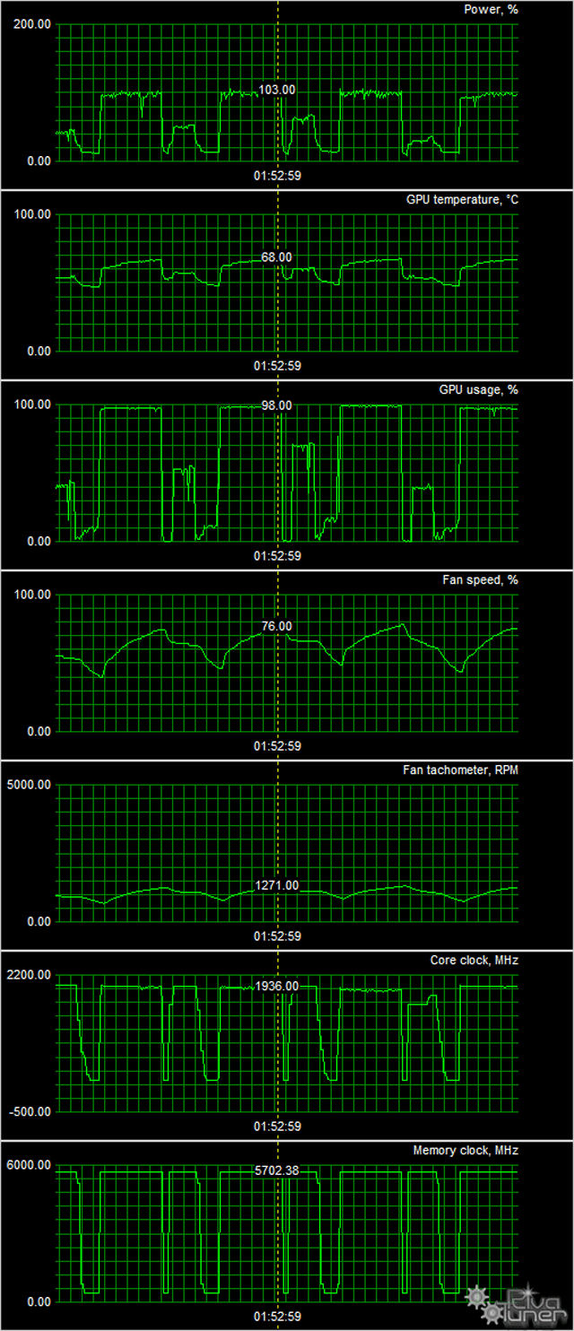 - Измерения проводились на расстоянии 50 см от видеокарты на уровне системы охлаждения.