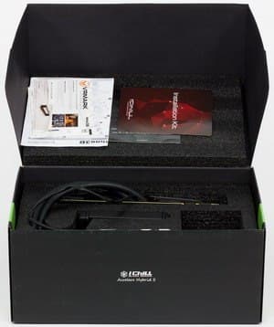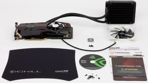 Inno3D iChill GeForce GTX 1080 Ti Black (11 ГБ) — топовый однопроцессорный ускоритель, использующий систему водяного охлаждения и фабрично разогнанный, за счет чего он демонстрирует производительность в среднем на 5% выше, чем референсный GTX 1080 Ti, копией которого, за исключением кулера, является. У рассмотренной карты iChill очень неплохой потенциал по разгону, что может стать дополнительным плюсом: наши исследования показали, что данный экземпляр смог стабильно работать на частоте ядра 1640—2120 МГц, а память смогла достичь эффективной частоты в 11760 МГц. При этом в высоких разрешениях уровня 4K мы получили прирост производительности почти в 8,5% относительно референс-карты. Тут, как вы понимаете, помогает усиленная СО карты. Впрочем, в отсутствие реальных конкурентов такие изыскания не слишком интересны, ведь даже без этого дополнительного разгона GTX 1080 Ti уверенно является на сегодня самым быстрым ускорителем, и его штатной производительности более чем хватает для всех современных игр даже в разрешении 4K. Кроме очень эффективной ЖСО стоит отметить подсветку на кулере для любителей моддинга и комплект поставки. Данный ускоритель полностью готов для работы совместно с устройствами VR.