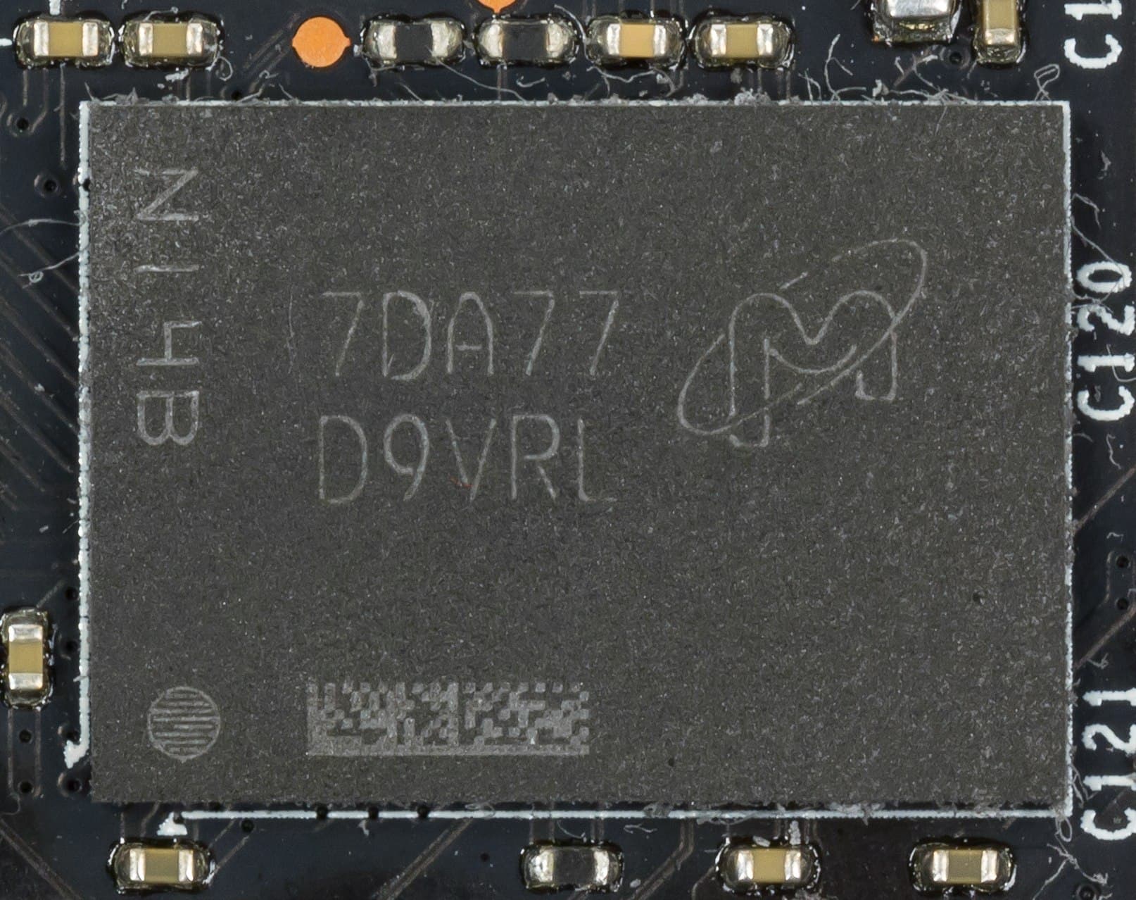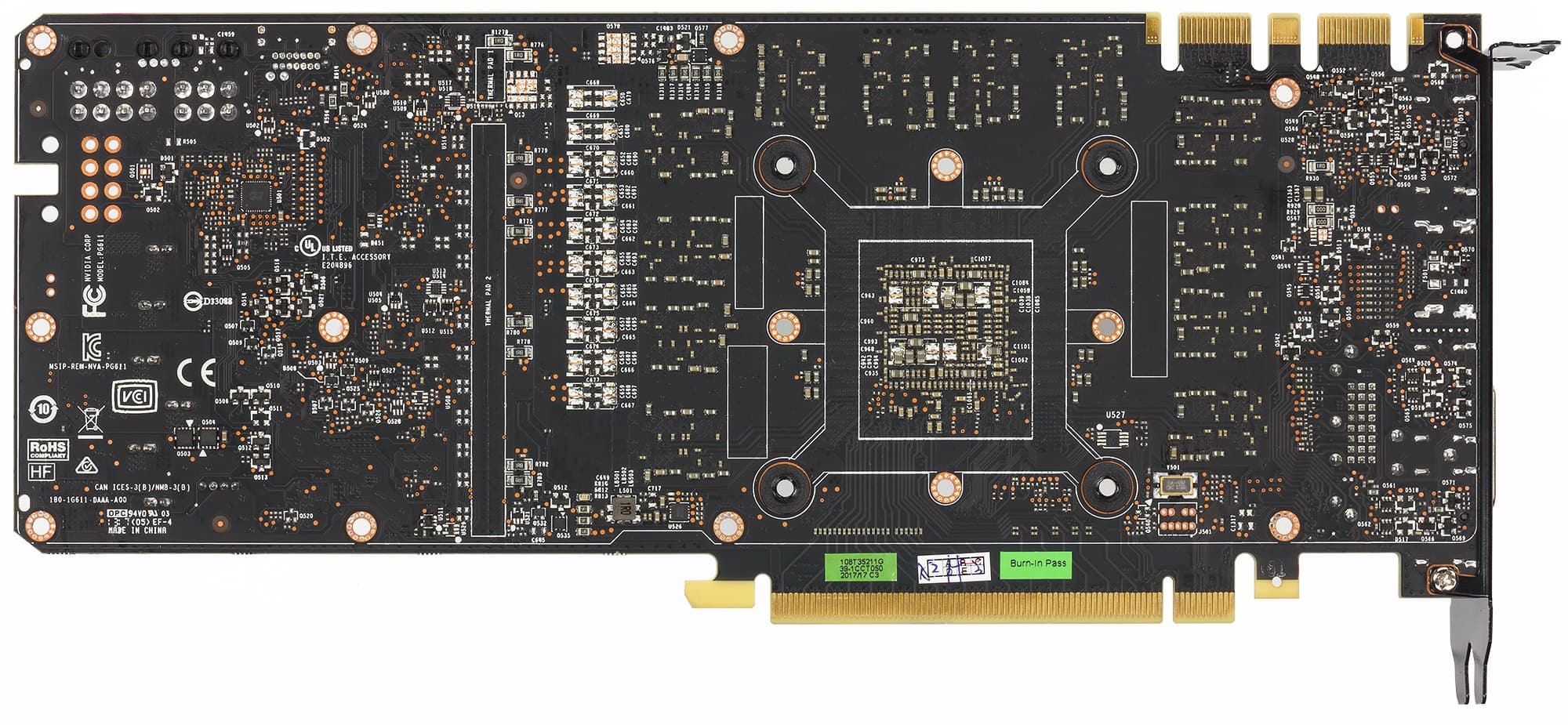 | Карта имеет 11 ГБ памяти GDDR5X SDRAM, размещенной в 11 микросхемах по 8 Гбит на лицевой стороне PCB. Микросхемы памяти Micron (GDDR5X) рассчитаны на номинальную частоту работы в 2800 (11200) МГц. | ![]() |