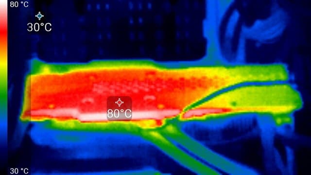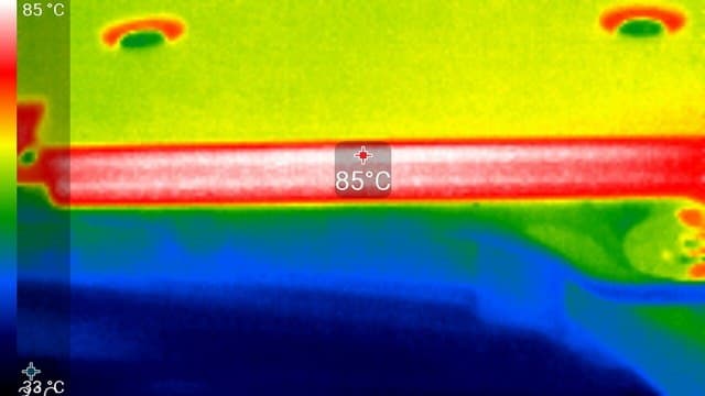 Максимальный нагрев — на краю печатной платы, который видно из-под пластины с обратной стороны.