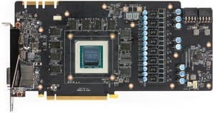 | Карта имеет 11 ГБ памяти GDDR5X SDRAM, размещенной в 11 микросхемах по 8 Гбит на лицевой стороне PCB. Микросхемы памяти Micron (GDDR5X) рассчитаны на номинальную частоту работы в 2800 (11200) МГц. | ![]() |