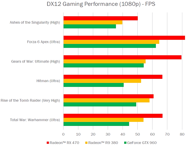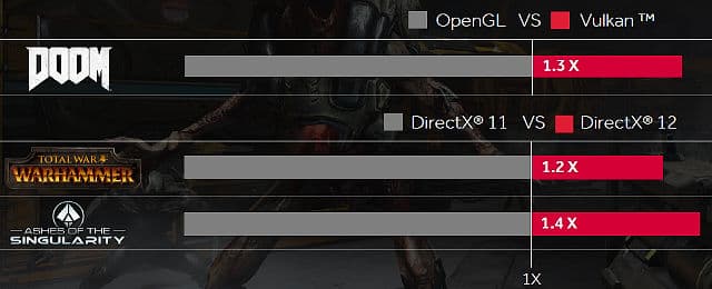 В пользу решений компании AMD выступает и то, что в большинстве игр текущего года с поддержкой DirectX 12 (Ashes of the Singularity, Hitman, Total War: Warhammer, Quantum Break, Gears of War и Forza APEX) видеокарты AMD Radeon на чипах архитектуры GCN чаще всего превосходят аналоги по цене из стана Nvidia: мы ранее уже отмечали преимущество Fury X против 980 Ti, R9 390 против GTX 970 и R9 380 против GTX 960 в таких играх, а модели видеокарт на базе Polaris 10 выступают еще сильнее. То же самое касается и игр, использующих новый графический API — Vulkan. В соответствующей версии игры Doom на решениях Radeon наблюдается очень большой прирост по сравнению с OpenGL-версией игры, что позволяет им с легкостью обходить конкурирующие видеокарты GeForce.