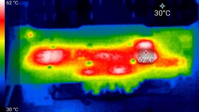 Максимальный нагрев 64 градуса — на печатной плате с обратной стороны в районе микросхем памяти.