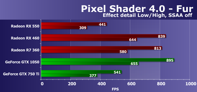 В задачах процедурной визуализации меха с большим количеством текстурных выборок, решения компании AMD выступали лучше еще со времен выпуска первых видеочипов на базе архитектуры GCN. И платы Radeon до сих пор в этих сравнениях выглядят весьма неплохо, но именно графические решения архитектуры Polaris немного сдали позиции, что видно по сравнению RX 460 с R7 360, идущих почти наравне. Рассматриваемая видеокарта Radeon RX 550 показала в этом тесте наименьшую производительность, сильно отстав от более мощных решения в виде Radeon R7 360 и RX 460.
