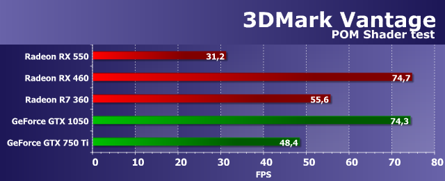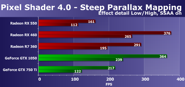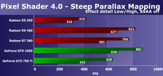 Если сравнивать скорость заполнения сцены самой младшей моделью видеокарты текущего поколения от компании AMD с результатами ускорителей Nvidia в этом тесте, то сегодняшняя новинка показала скорость заполнения сцены в 1,5 раза выше, чем GeForce GTX 750 Ti, хоть и отстала почти вдвое от более дорогой модели GTX 1050, которая является лидером этого теста. Вот такие большие отрывы в скорости заполнения, в зависимости от целевого рыночного сегмента. Feature Test 3: Parallax Occlusion Mapping