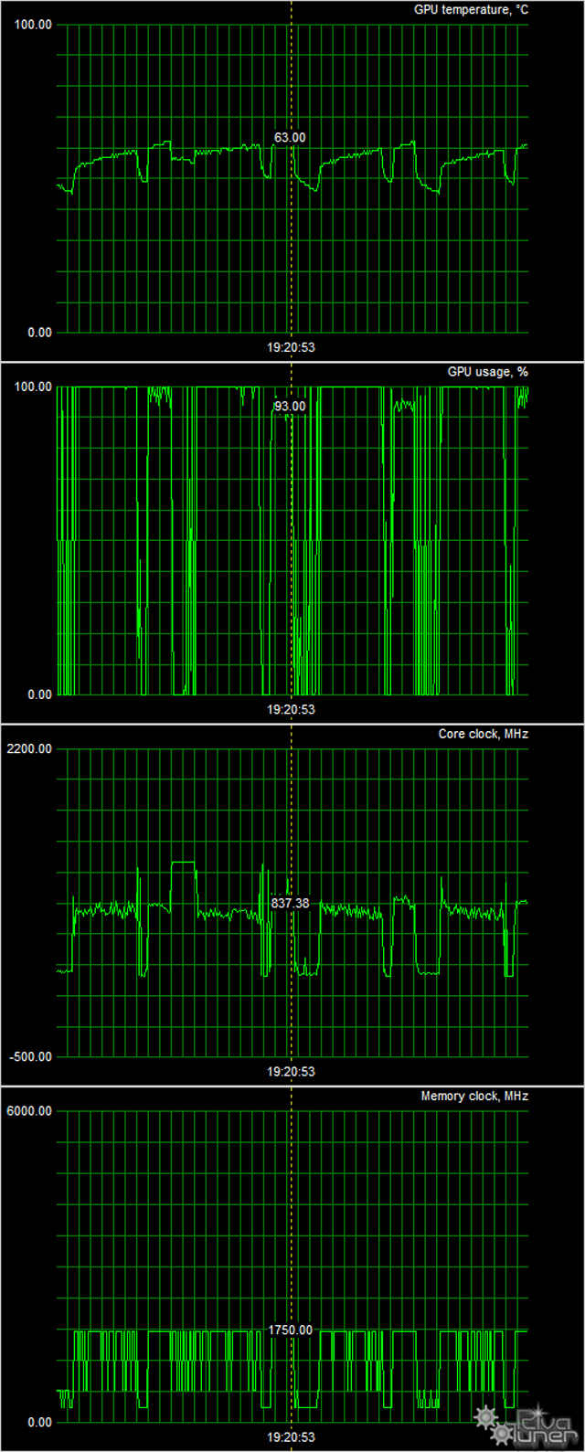 Поскольку работа вентилятора на этой карте не регулируется и не мониторится, частоту его вращения определить было невозможно, а вентилятор работает всегда, вне зависимости от нагрева GPU.