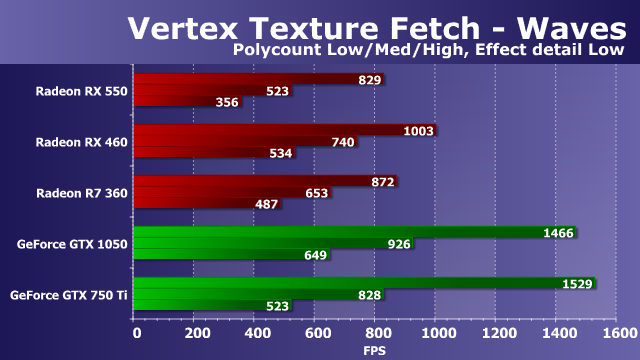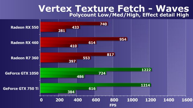 Результаты во втором тесте вершинного текстурирования «Waves» не слишком похожи на то, что мы видели на предыдущих диаграммах, так как решения Nvidia тут явно медленнее, но для Radeon RX 550 это мало что меняет. Скоростные показатели новинки AMD в этом тесте все равно ниже всех остальных решений, и разница в производительностью между худшей видеокартой RX 550 и лучшей GTX 1050 двукратная, что неудивительно, так как GPU, на которых основаны эти видеокарты, очень разные и по сложности и по площади ядра. Рассмотрим второй вариант этой же задачи: