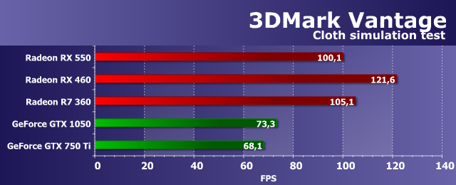 В данном случае важны и математическая и текстурная производительность, и в этой «синтетике» из 3DMark Vantage младшая плата Radeon семейства RX 500 на базе архитектуры Polaris снова показала относительно слабый результат, легко объяснимый теорией. Radeon RX 550 просто не может опередить модели из предыдущих семейств Radeon и конкурентов от Nvidia так как они имеют куда большее количество исполнительных устройств. Отставание новинки соответствует теоретическим данным, но оно снова даже больше, чем должно бы быть. Ведь RX 550 отстала от R7 360 чуть ли не в два раза, а RX 460 оторвалась еще дальше. Да и видеокарты Nvidia заметно сильнее. В общем, Polaris 12 просто не хватает математической производительности. Feature Test 4: GPU Cloth
