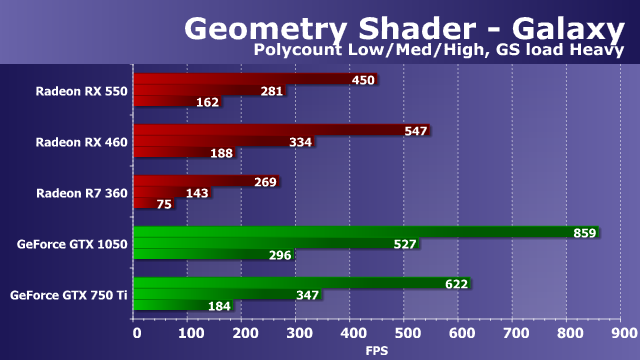 При изменении нагрузки в этом тесте цифры почти не изменились и для плат AMD и для решений Nvidia, поэтому и в наших выводах ничего не меняется. Видеокарты в этом тесте геометрических шейдеров слабо реагируют на изменение параметра GS load, отвечающего за перенос части вычислений в геометрический шейдер. Radeon RX 550 в этом подтесте показала результат чуть хуже платы предыдущего поколения на основе той же архитектуры Polaris, обе они сильно отстали от GeForce GTX 1050, но вот GeForce GTX 750 Ti не смогла уйти далеко вперед. Radeon RX 550 уступила ей порядка 15-25%, что не так уж много.