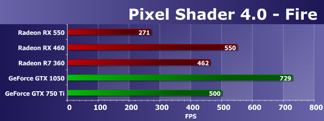Рассмотрим второй тест шейдерных вычислений, который носит название Fire. Он тяжелее для ALU, и текстурная выборка в нем только одна, а количество инструкций типа sin и cos увеличено вдвое, до 130. Посмотрим, что изменилось при увеличении нагрузки: