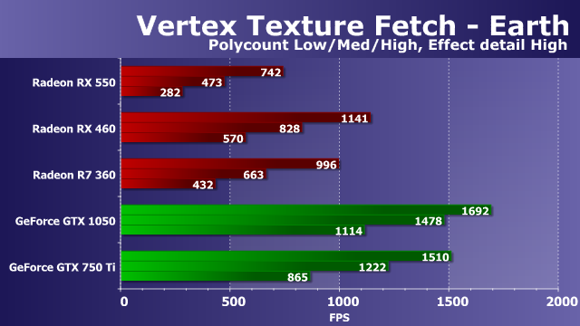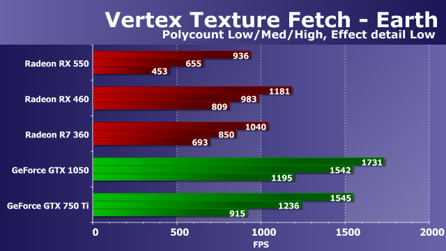 В тестах «Vertex Texture Fetch» измеряется скорость большого количества текстурных выборок из вершинного шейдера. Тесты схожи, по сути, так что соотношение между результатами карт в тестах «Earth» и «Waves» должно быть примерно одинаковым. В обоих тестах используется displacement mapping на основании данных текстурных выборок, единственное существенное отличие состоит в том, что в тесте «Waves» используются условные переходы, а в «Earth» — нет.