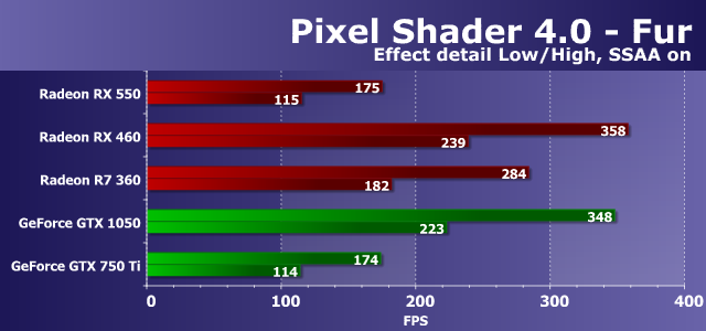 Первым тестом пиксельных шейдеров будет Fur. При самых низких настройках в нем используется от 15 до 30 текстурных выборок из карты высот и две выборки из основной текстуры. Режим Effect detail — «High» увеличивает количество выборок до 40—80, включение «шейдерного» суперсэмплинга — до 60—120 выборок, а режим «High» совместно с SSAA отличается максимальной «тяжестью» — от 160 до 320 выборок из карты высот.