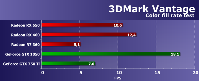 Цифры второго подтеста 3DMark Vantage обычно показывают производительность блоков ROP, без учета величины пропускной способности видеопамяти (т. н. «эффективный филлрейт»), и тест измеряет именно производительность ROP. И вот как раз по этим показателям у рассматриваемой нами сегодня платы Radeon RX 550 все просто прекрасно, как в теории, так и на практике! Новинка опередила самое старое решение в виде Radeon R7 360 более чем вдвое, да и от стоящей на ступень выше видеокарты из предыдущего поколения отстала не так уж сильно.