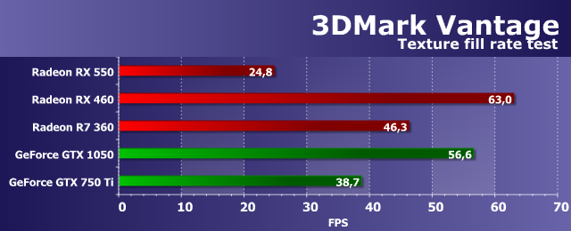 Синтетические тесты из пакета 3DMark Vantage могут показать нам другие результаты, на что мы и надеемся. Feature тесты из этого тестового пакета обладают поддержкой DirectX 10, до сих пор актуальны и интересны тем, что отличаются от наших и реже упираются в ПСП. При анализе результатов видеокарты Radeon RX 550 в этом пакете мы наверняка сделаем какие-то новые и полезные выводы, ускользнувшие от нас в тестах из пакетов семейства RightMark. Feature Test 1: Texture Fill