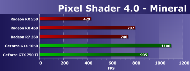 Более сложный режим не особенно изменил соотношение сил в нашем сравнении, разве что младшая GeForce провалилась сильно. Графические решения AMD Radeon и в этом D3D10-тесте пиксельных шейдеров всегда работали эффективнее конкурирующих плат GeForce, но модели от Nvidia, основанные на архитектуре Pascal, догнали своих соперников. Напоминаем, что в нашем сравнении нет решений с равным ценовым позиционированием, и именно поэтому сегодняшняя героиня, младшая в семействе Radeon RX 500, показала результат явно хуже всех остальных GPU, кроме GeForce GTX 750 Ti, которую она почти догнала в самом тяжелом режиме.