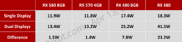 В семействе Radeon RX 500 ввели третий, промежуточный режим работы видеопамяти, и теперь Radeon RX 580 потребляет заметно меньше энергии в таких условиях по сравнению с Radeon RX 480. Так, при подключении двух 4К-дисплеев по DisplayPort RX 580 требует всего лишь на 1,5 Вт больше энергии по сравнению с конфигурацией из одного подключенного дисплея, а RX 480 в таких условиях расходует почти на 8 Вт больше. Про Radeon R9 380 и не говорим, он черпает энергию большими ложками.