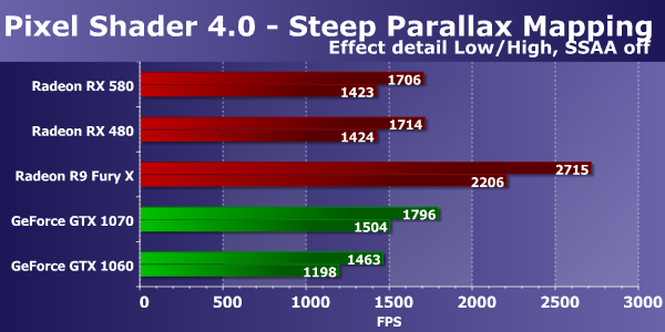 Более сложный режим не сильно изменил соотношение сил в нашем сравнении. Графические решения AMD Radeon и в этом D3D10-тесте пиксельных шейдеров всегда работали эффективнее конкурирующих плат GeForce, и только самые новые модели GeForce, основанные на архитектуре Pascal, могут поспорить с ними. Но и то не при равном позиционировании, ведь вышедшая сегодня старшая модель семейства Radeon RX 500 показала результат явно выше уровня GeForce GTX 1060, которая уступила новинке до 26%, а GTX 1070 была лишь немногим быстрее.
