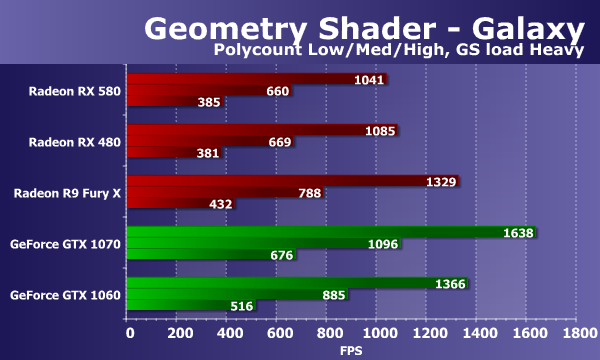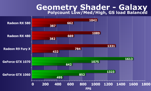Новая модель Radeon RX 580 имеет те же специальные оптимизации, что и RX 480, но GPU у нее работает на повышенной частоте, что должно было привести и к лучшему результату. Но увы, разницы между этими решениями в нашей синтетике снова нет, новинка даже немного уступила Radeon RX 480, и обе они чуть отстают от Radeon R9 Fury X. Естественно, что GeForce GTX 1060 оказалась быстрее их всех, а старшая плата Nvidia текущего поколения в виде GTX 1070 стала лидером этого теста. Посмотрим, как изменится ситуация при переносе части вычислений в геометрический шейдер: