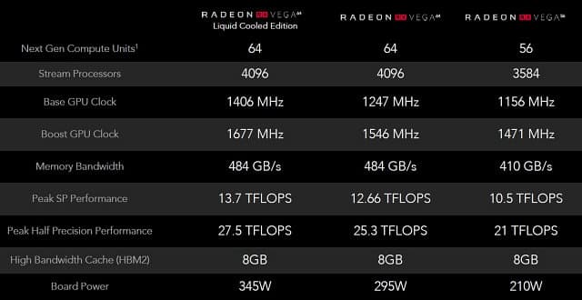 Судя по спецификациям, три представленные модели отличаются друг от друга только по количеству исполнительных блоков, частотам GPU и памяти, а также значениям энергопотребления — от 210 Вт у слабой карты до 345 Вт у топового варианта с жидкостным охлаждением. К слову, хоть это и не анонсировалось пока что, но в будущем весьма вероятен выпуск Nano-варианта Vega с печатной платой миниатюрных размеров и уровнем потребления энергии в 150 Вт — такую видеокарту уже подарили известному разработчику Тиму Свини (Unreal Engine).