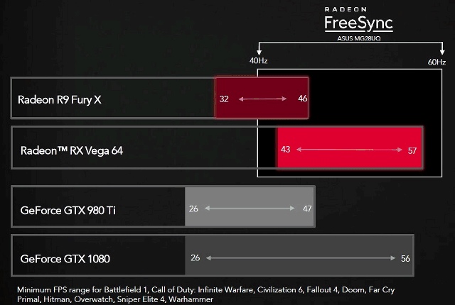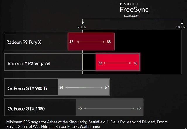 Ну да ладно, перейдём к тестам. Специалисты AMD предлагают для начала не просто посмотреть на цифры FPS, а на то, входят ли они в комфортный предел для FreeSync (и G-Sync, соответственно) мониторов. К примеру, для FreeSync-мониторов с разрешением 3440×1440 этот тип синхронизации работает при частоте обновления от 48 до 100 Гц, поэтому для максимального комфорта нужна частота кадров в этих пределах. Если решения Nvidia обеспечивают такую скорость не всегда, то Radeon RX Vega 64 справляется с задачей куда лучше GeForce GTX 1080 (замеры производила AMD, напоминаем).