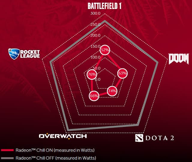 Не можем мы обойти и вопросы работы программных технологий. Так, использование технологии Radeon Chill, позволяющей ограничить частоту кадров, а вместе с ней и потребление энергии, обеспечивает значительно лучшую энергоэффективность, по сравнению с обычным режимом по умолчанию. В протестированных специалистами AMD играх (не только нетребовательных сетевых, вроде Dota 2, но и таких проектах, как Battlefield 1) было отмечено снижение энергопотребления на 50%-75%, что может быть весьма полезно.