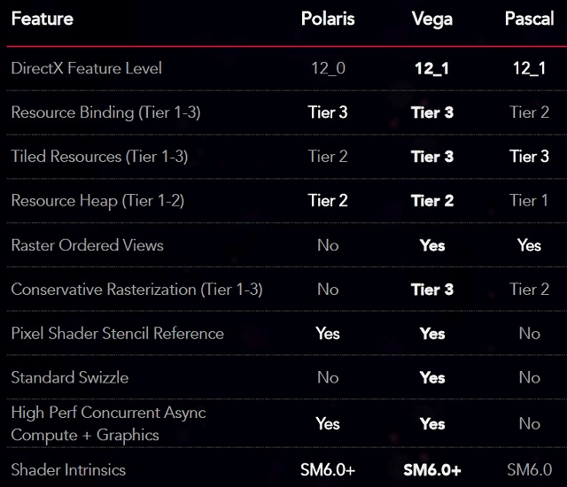 Высокая производительность — это отлично, но не менее важна и функциональность. Новые пиксельные движки Vega 10 были специально доработаны для поддержки большинства функций DirectX 12 с уровнем возможностей Feature Level 12_1, а также имеют расширенную поддержку Vulkan 1.0. В результате, новый графический процессор AMD имеет наиболее полную поддержку Feature Level 12_1 на данный момент, которая превосходит не только GPU компании прошлого поколения, но и лучшего из имеющихся конкурентов — графические процессоры семейства Nvidia Pascal.