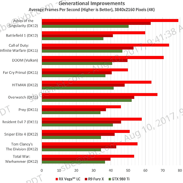 Наверняка эти сравнения AMD не обошлись без лукавства, да и сравнивали они новинку с решением конкурента только в удобных для себя приложениях. Давайте посмотрим на расширенный список игровых тестов, которые тоже сделала сама AMD. Правда, тут они уже сравнивают новинку не с GTX 1080, а с GTX 980 Ti предыдущего поколения: