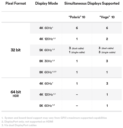 Как и Polaris, новая Vega поддерживает до шести одновременно подключенных дисплеев, но эта поддержка расширена в сторону больших разрешений, частоты обновления и глубины цвета. HDR-дисплеи требуют большей полосы пропускания из-за увеличения объёма передаваемой информации, и поэтому многомониторные системы имеют более жёсткие ограничения по подключению. Vega 10 утраивает число подключаемых мониторов при 4K 60 Гц и 64-битном HDR-формате, и добавляет поддержку двух дополнительных режимов вывода, на которые не способен Polaris.