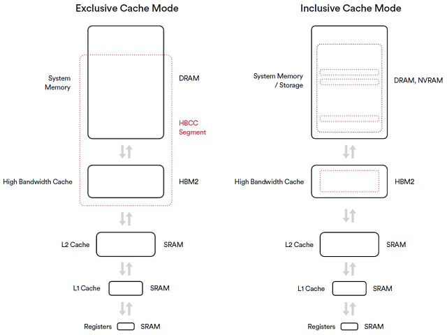 Для того, чтобы HBM2-память работала как кэш для системной памяти, энергонезависимой памяти (твердотельные SSD-накопители) или даже сетевых накопителей, нужно специальное управление всей этой иерархией — чтобы GPU брал данные из одного места и сохранял их в других по мере необходимости. Для решения этих задач в графический процессор Vega был внедрен новый контроллер высокопроизводительной кэш-памяти — High Bandwidth Cache Controller (HBCC).